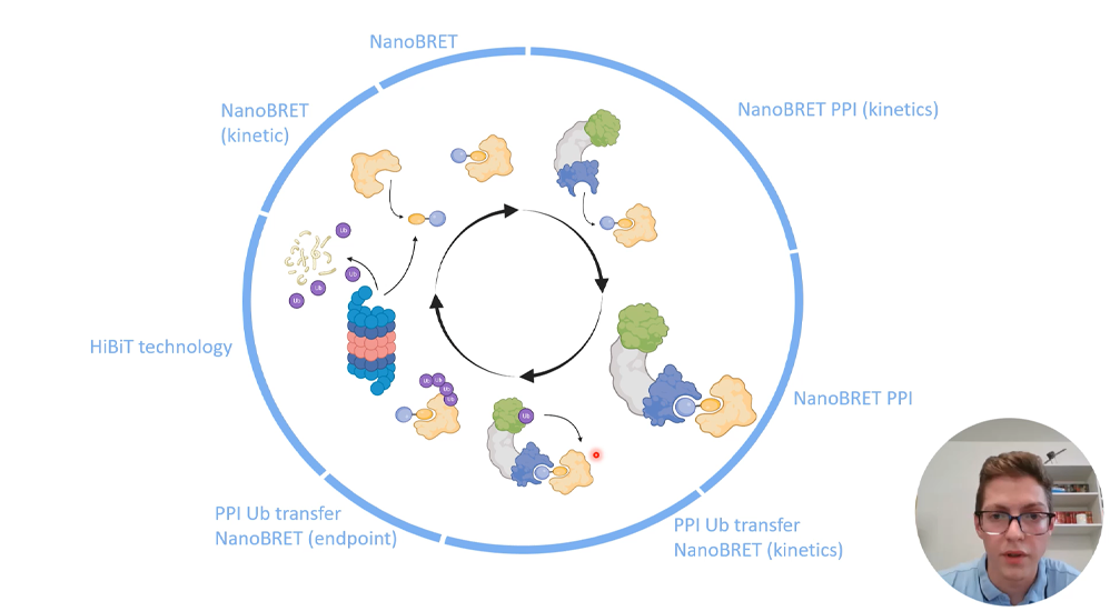 Targeted protein degradation (TPD) is an emerging technology to tackle diseases and related small molecules are crowding into the clinic. The most prominent approach for TPD are the bifunctional PROteolysis TArgeting Chimeras (PROTACs). In this technology, the compounds hijack a multistep degradation cascade which ultimately leads to the proteasomal degradation of the POI. For this, PROTACs contain a POI ligand, and a so called “handle” which recruits an E3 ubiquitin ligase, while both are connected through a linker. Due to the high complexity of the underlying mechanism, validation of these small molecules harbours diverse challenges and requires investigation of every single PROTAC-induced event to fully understand the behaviour and success of chemical series of degrader molecules.