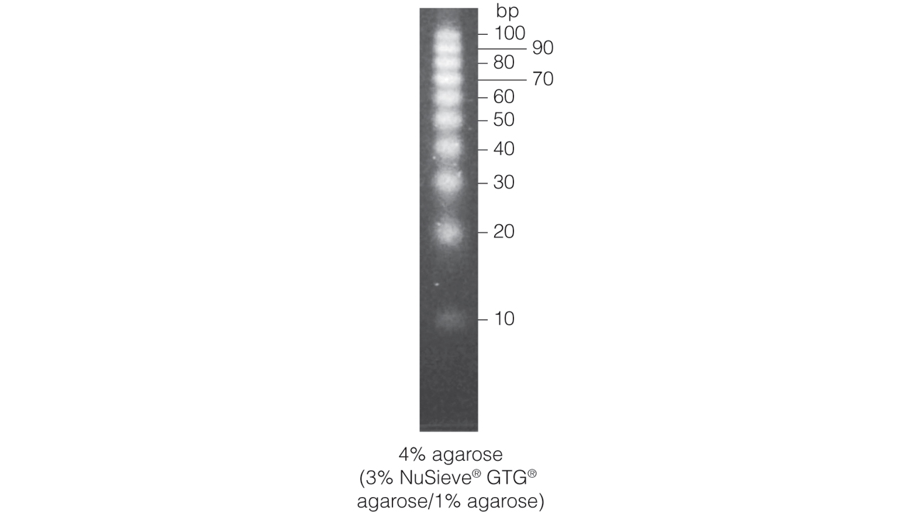 The 10bp DNA Step Ladder has ten blunt-ended DNA fragments ranging from 10bp to 100bp in exactly 10bp increments. All of the bands are of approximately equal intensity with the exception of the 10bp band, which may appear slightly less intense.